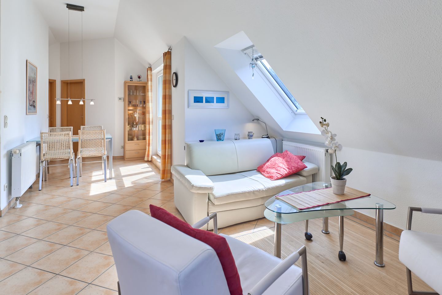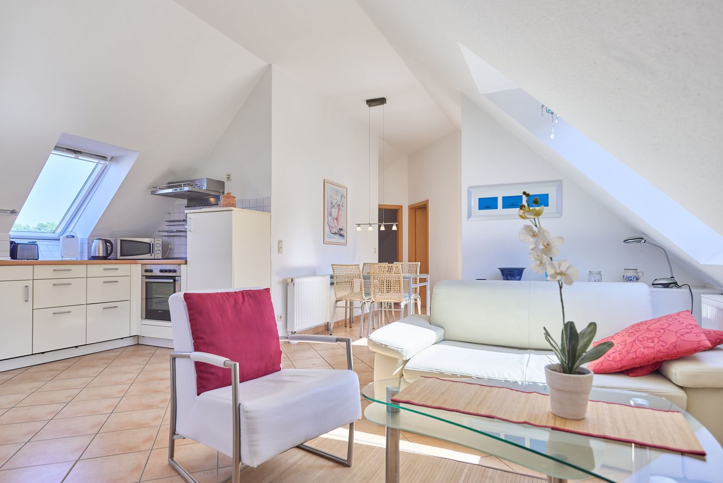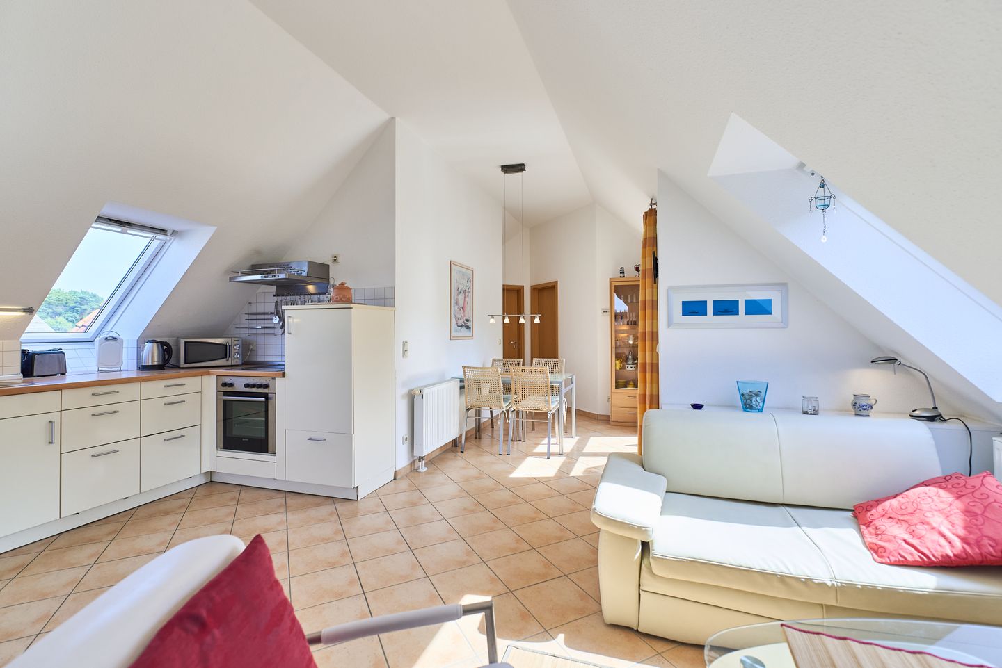 Das geräumige Wohnzimmer ist der perfekte Ort, um den Tag ausklingen zu lassen. Ausgestattet mit einem gemütlichen Sofa, Sessel, HiFi-Anlage und zwei Fernsehern lässt es an Annehmlichkeiten nicht fehlen. Hier können Sie entspannen, Spiele spielen oder in einem Buch aus der kleinen Bibliothek schmökern. Der Zugang zum Balkon lädt ein, die frische Ostseeluft zu genießen und abends den Sonnenuntergang über den malerischen Waldlandschaften zu beobachten. Zusätzliche Extras wie Bettwäsche und Handtücher (diese sind NICHT in Ihrer Buchung enthalten),können über unsere Gäste-App dazu gebucht werden.