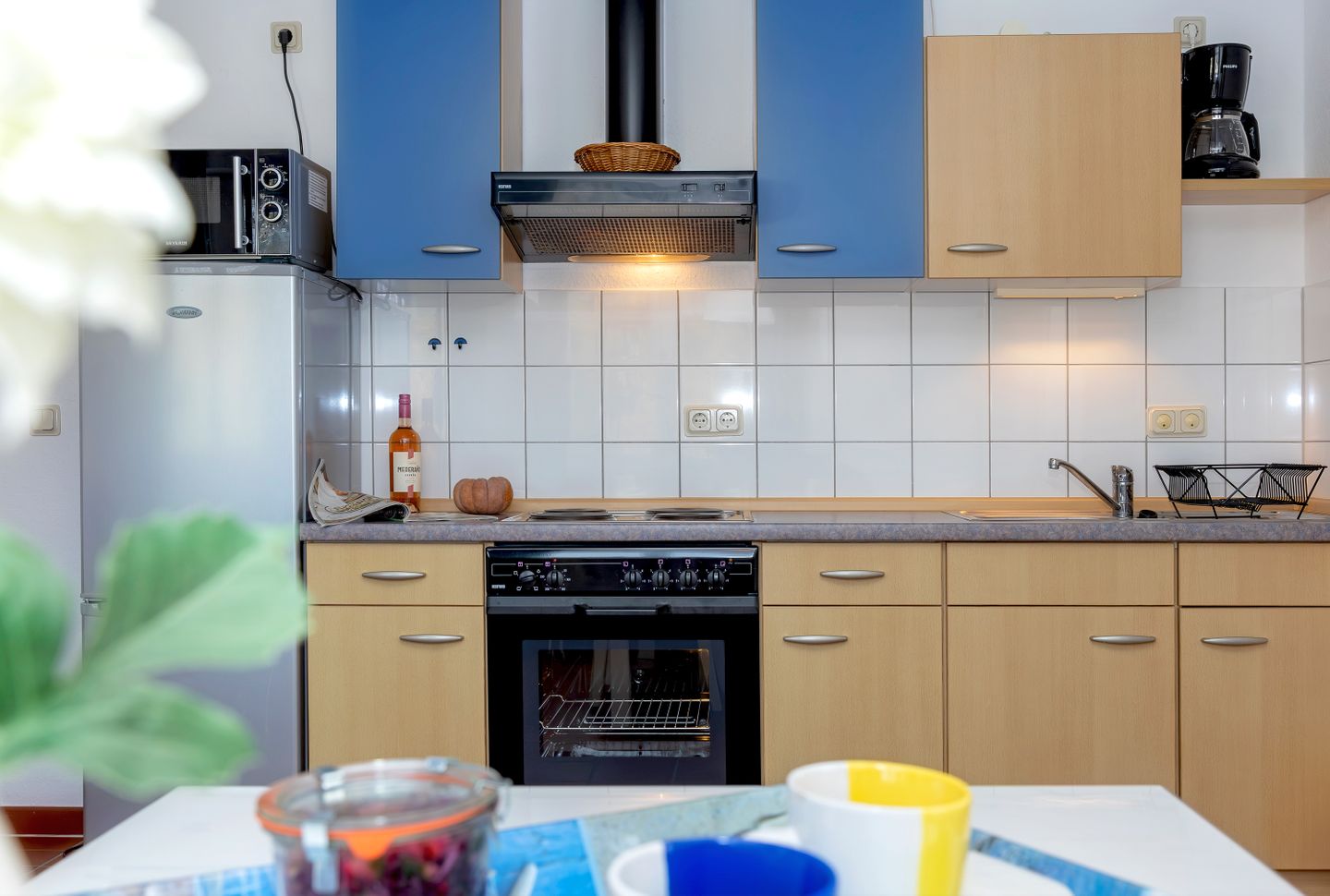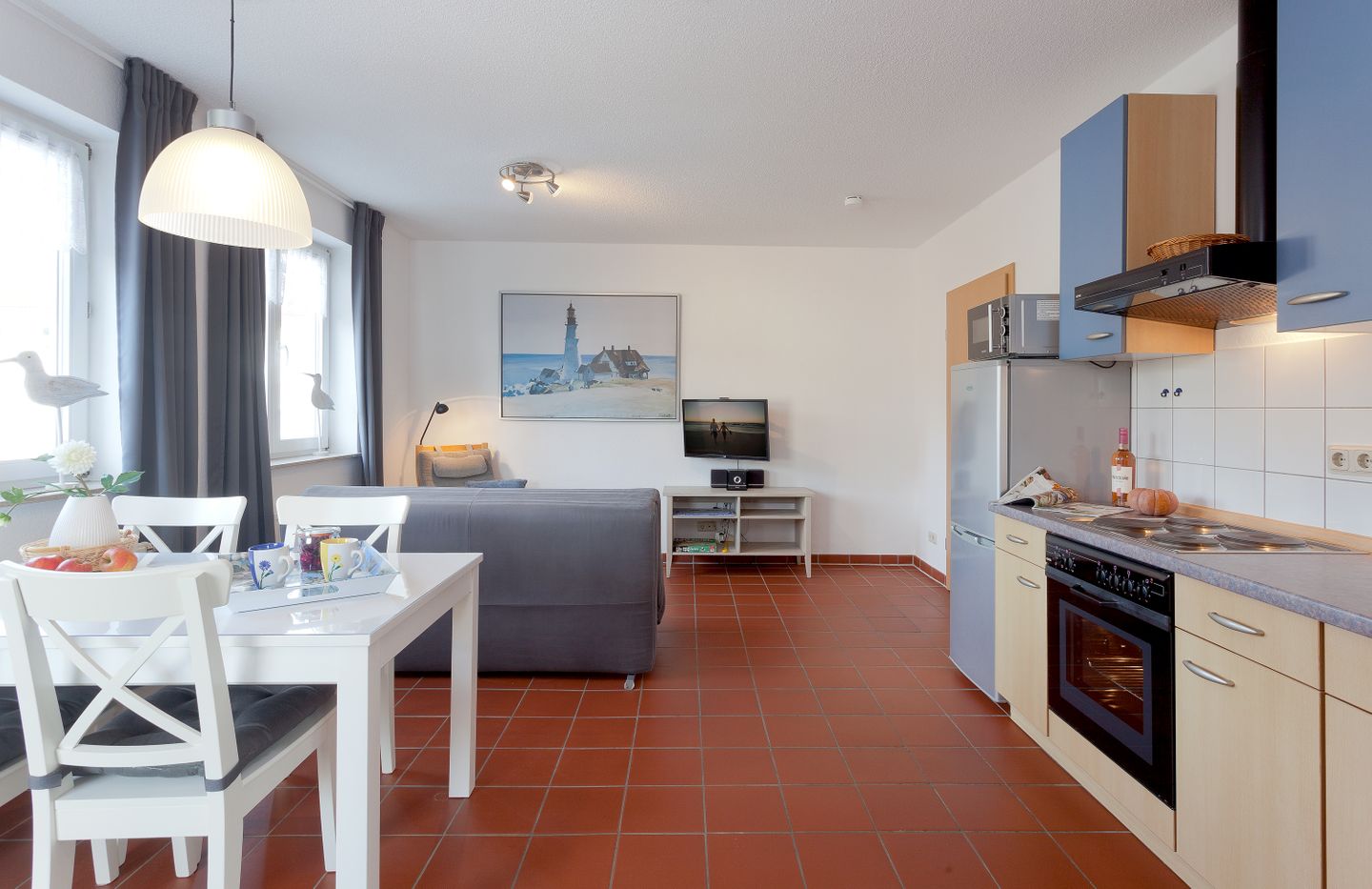 Die offen gestaltete Küche ist funktional eingerichtet und mit einem 4-Platten-Herd, Elektrobackofen, Mikrowelle, Kühlschrank und einem separaten Gefrierschrank ausgestattet. Weiterhin stehen Ihnen Kaffeemaschine, Toaster, Wasserkocher, Geschirr und Besteck sowie ein Abfalleimer zur Verfügung, sodass Sie auch im Urlaub nicht auf die gewohnte Küchenausstattung verzichten müssen.