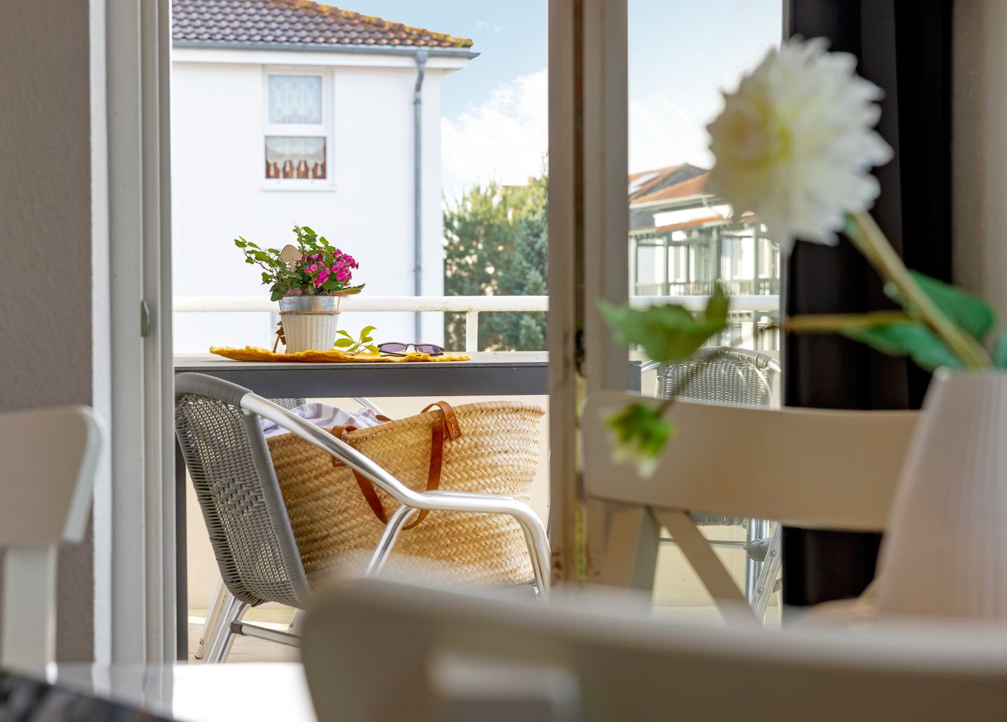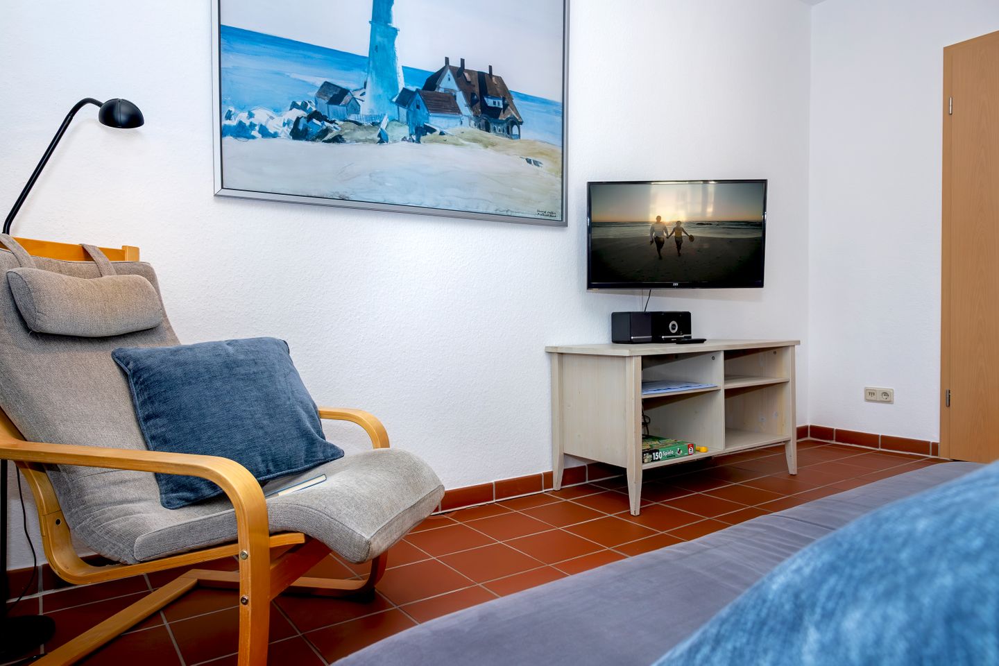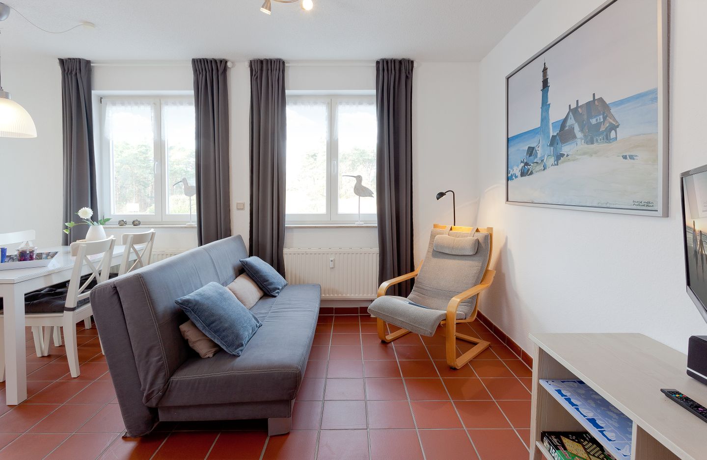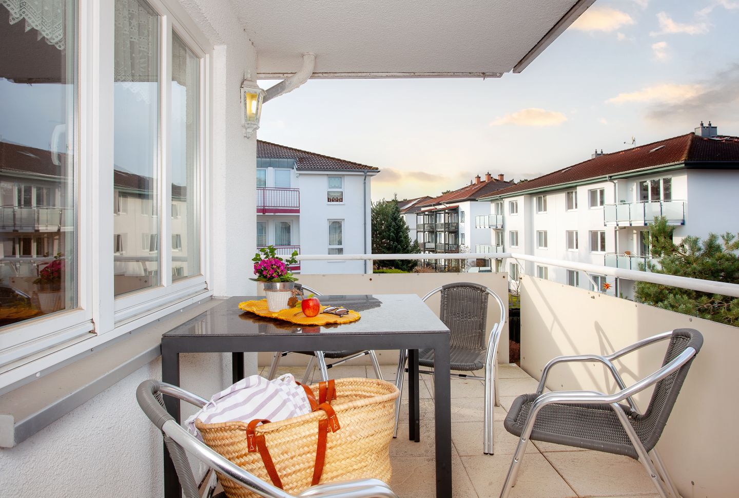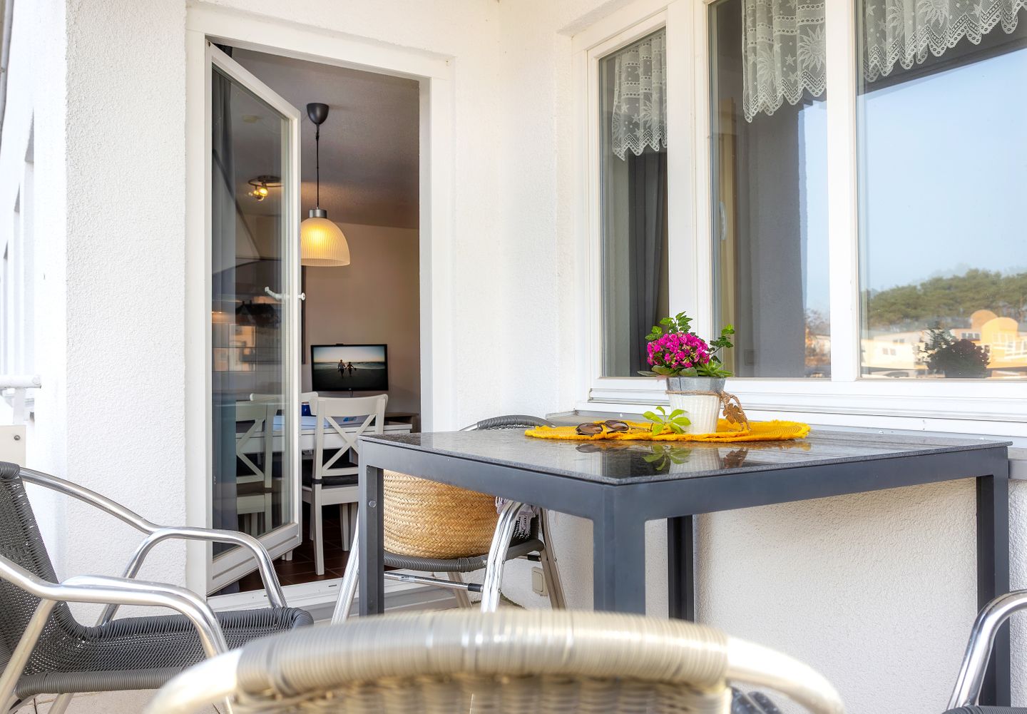 Ein besonderes Highlight der Ferienwohnung ist der überdachte Balkon, der mit Gartenmöbeln ausgestattet ist. Hier können Sie windgeschützt sitzen, lesen oder den Tag entspannt ausklingen lassen – selbst bei wechselhaftem Wetter. Alle Fenster der Wohnung sind mit Sichtschutz versehen, was Ihnen Privatsphäre während Ihres gesamten Aufenthalts bietet.