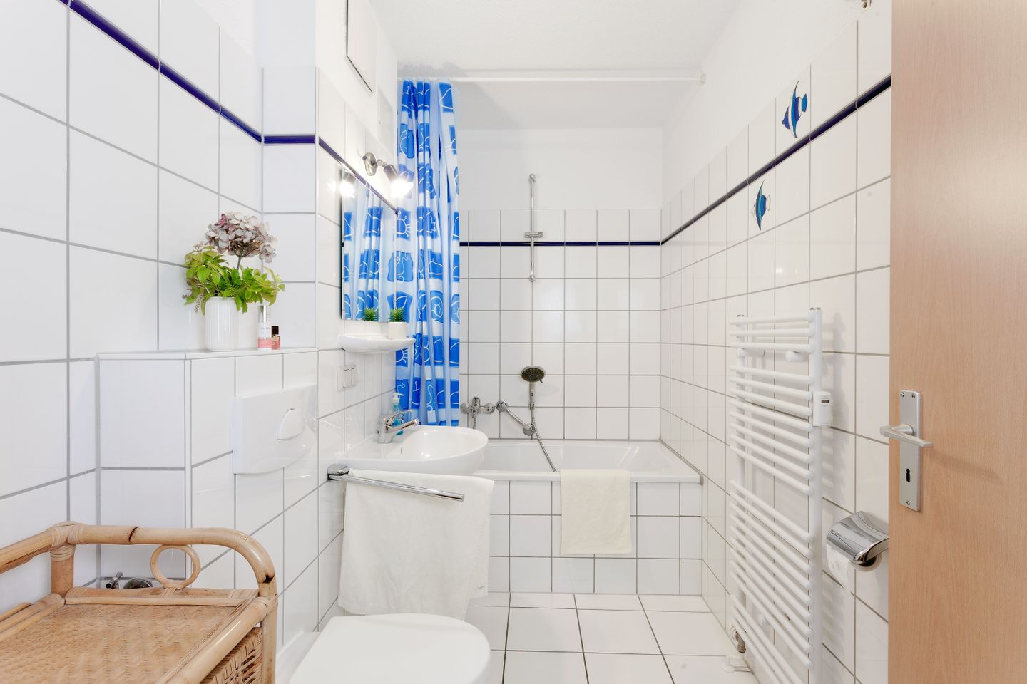 Das Badezimmer zeichnet sich durch eine Badewanne, ein Waschbecken, einen Spiegel sowie einen Haartrockner aus. WC und Warmwasser sind selbstverständlich vorhanden. Diese Ausstattung sorgt für angenehmen Komfort nach einem ausgedehnten Strandtag oder einer Fahrradtour.