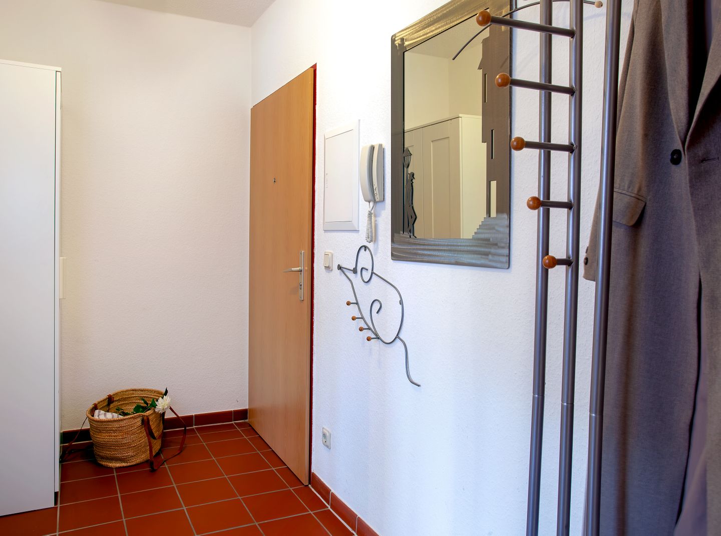Zur Ausstattung gehören weiterhin Zentralheizung und Rauchmelder, die ganzjährig ein angenehmes Wohnklima sowie Sicherheit gewährleisten. Ein kostenloser Privatparkplatz direkt am Haus ermöglicht eine bequeme Anreise und kurze Wege zum Fahrzeug. Ein Staubsauger, ein Wäscheständer und eine Garderobe runden das Angebot für alltägliche Bedürfnisse ab.